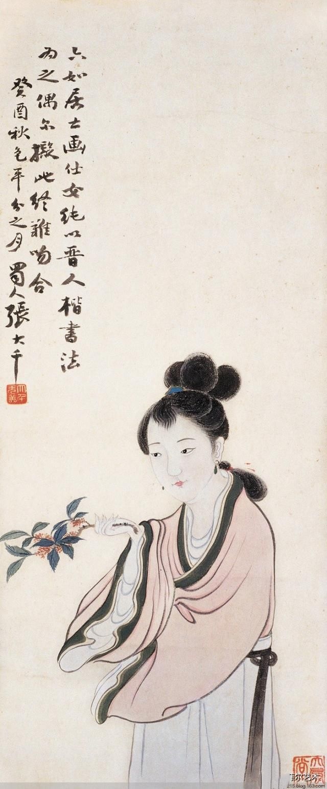有别于傅抱石所绘仕女的潇洒入神,风格高古;齐白石仕女的神态生动;林风眠仕女的色彩浓丽,张大千的仕女可谓清丽秀雅、别有风姿。因为他眼中的美人标准要比常人苛刻得多,不仅要长得美,而且气质要“娴静娟好,有林下风度,遗世而独立之姿,一涉轻荡,便为下乘”。他笔下的美女端庄健康,充满青春活力,不乏当代女性的气息与风采。