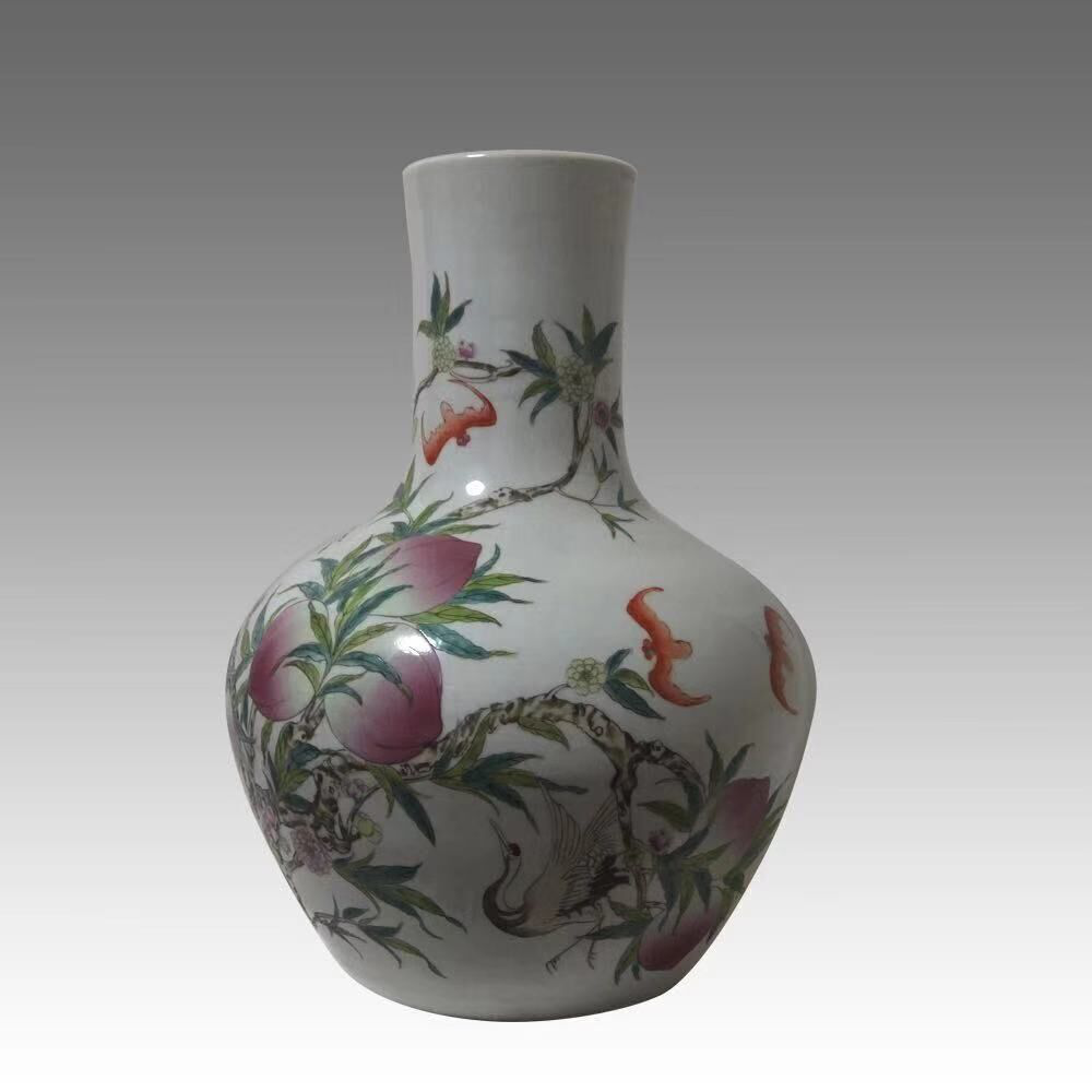 粉彩九桃五蝠天球瓶,寓意平安吉祥