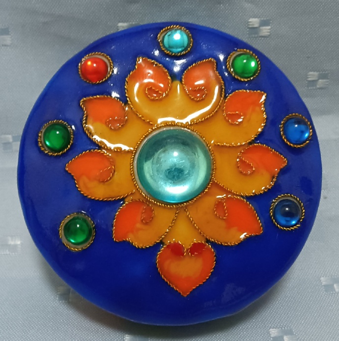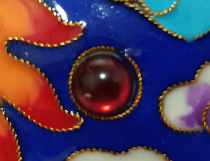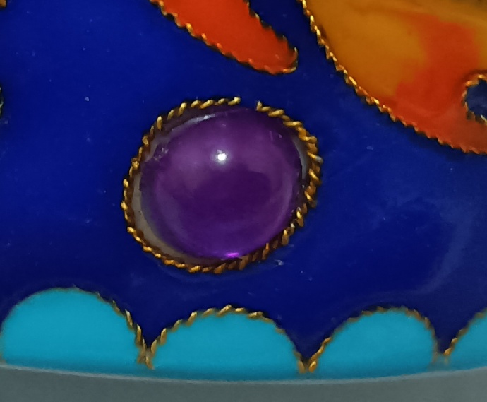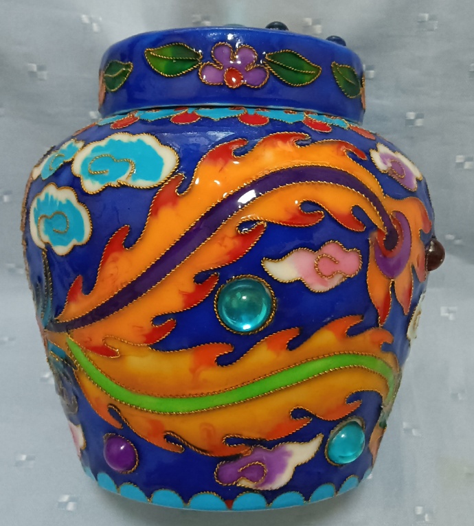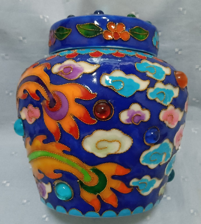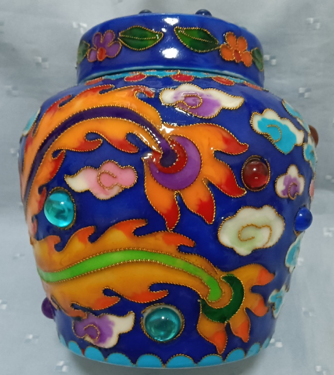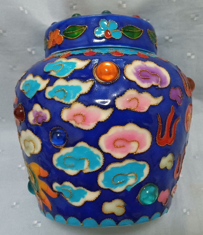 罐外蓝色地,盖上外一圈镶蓝两颗,绿四颗,红色一颗,宝石七颗。内杏黄色大花朵,花朵中心镶一颗大浅绿色宝石,盖上面共镶八颗宝石。盖外侧两绿色叶中间紫,杏黄,蓝色花朵,共五组花叶纹。