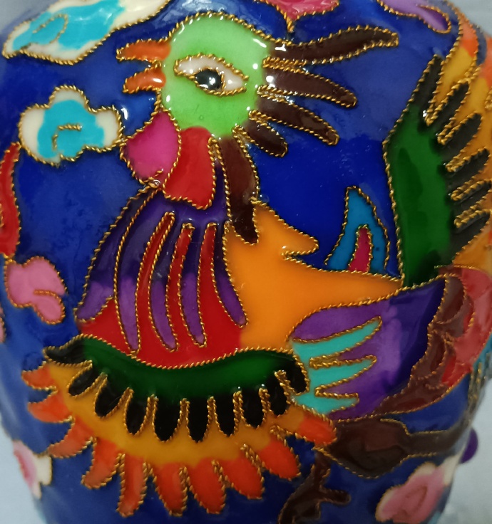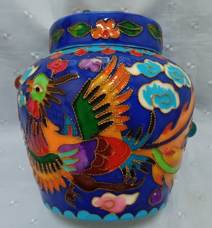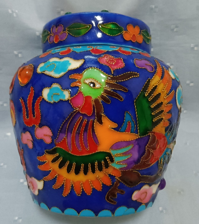 罐肩部绿色地一圈绿,红色祥云纹。罐腹画一只大凤凰,浅绿色头,杏黄色嘴,白色眼黑色眼珠,紫红色冠,红,紫,杏黄,蓝色多色画凤凰身长的双尾,飞翔在红,绿,白,粉红色祥云纹中。罐腹镶蓝一颗,绿三颗,红色两颗,杏黄色两颗,宝石八颗。