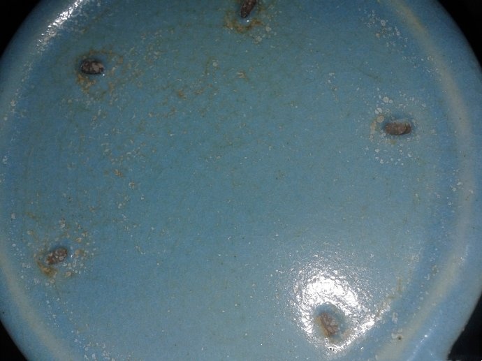 4、烧造特征:宋代宫廷用汝窑器物一般均采用满釉支烧,为了避免窑炉内杂质的污染,需用匣钵装好,并将器物用垫圈和支钉垫起,防止与匣钵粘连。在器物底部可见细如芝麻状的支钉痕三、五、七个,六个支钉的很少,痕迹很浅,大小如粟米。