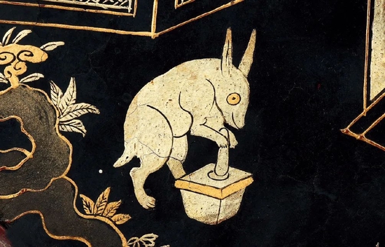 圆形瓷板,正面以粉彩绘三星高照图,寓意吉祥,福、禄、寿三星相会,或怀抱婴童,或手捧如意,或拄葫芦宝杖;背面以“彩金象”漆艺绘广寒宫图,琼楼玉宇被云雾缭绕,嫦娥正凭栏观看玉兔捣药,此一漆绘工艺流行于雍正、乾隆时期江南地区,嘉庆以后不见。