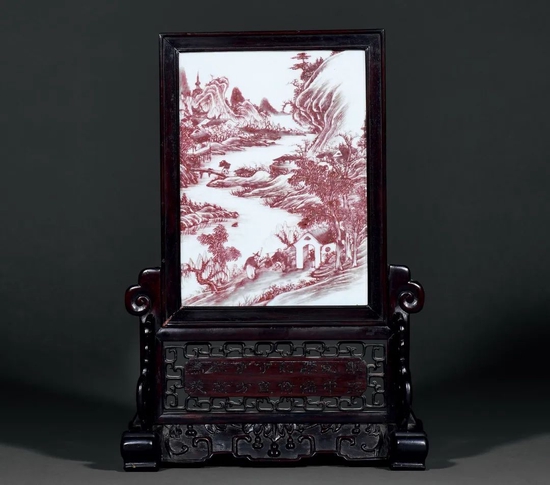 砚屏以釉里红山水人物图瓷板为屏心,绘溪光山色,高士策杖归家,文人吟读于水榭之中,充满恬淡的隐逸气息。釉里红发色均匀纯正,纹饰清晰。