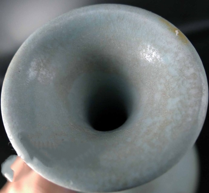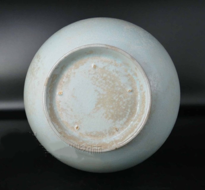 再观其胎,胎体厚薄均匀,相对趋厚重,属于厚胎汝瓷,其胎为香灰胎色,更不在话下。其中,可见其底五粒微小的支烧铮钉痕,其形更是极为典型的芝麻之形,北宋汝器应有之特征。故以其釉色包浆,诸般质色质地乃至鉴别要点来看,此瓶尽管器形较大,胎体相对较厚,然而重要之处,皆彰显北宋真汝以及出土之貌相,谓之大门洞开,毫不虚妄。