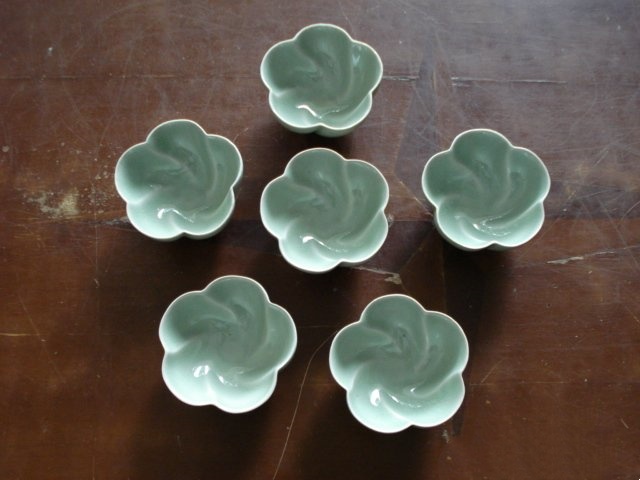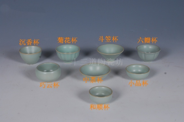 6、东道:广州恒福窑口产,仿汝品牌。东道汝窑器物形式多样,造型规整,多有亚光,外感纯净,釉色很正。由于走大众化之路,所以产量相对比较大,价格适中,很适于一般茶人赏玩。其杯具属于小开片,开片清晰、均匀、紧凑。东道的禅定杯、石磨杯、梅颂杯、菩提杯等属于经典款式。单杯在上百元至400元以内,套杯则达上千元。但是目前,南方已经有不少窑口开始制假东道,市场上东道已经有很多假货。假的东道茶杯价格很低,釉面暗淡、稀薄。