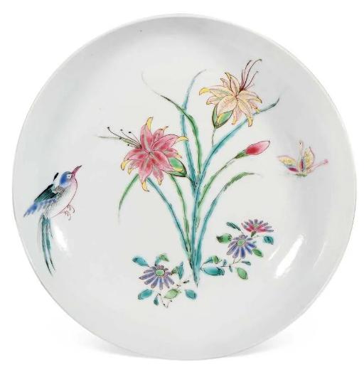 6.清雍正粉彩萱草花绶带鸟纹盘