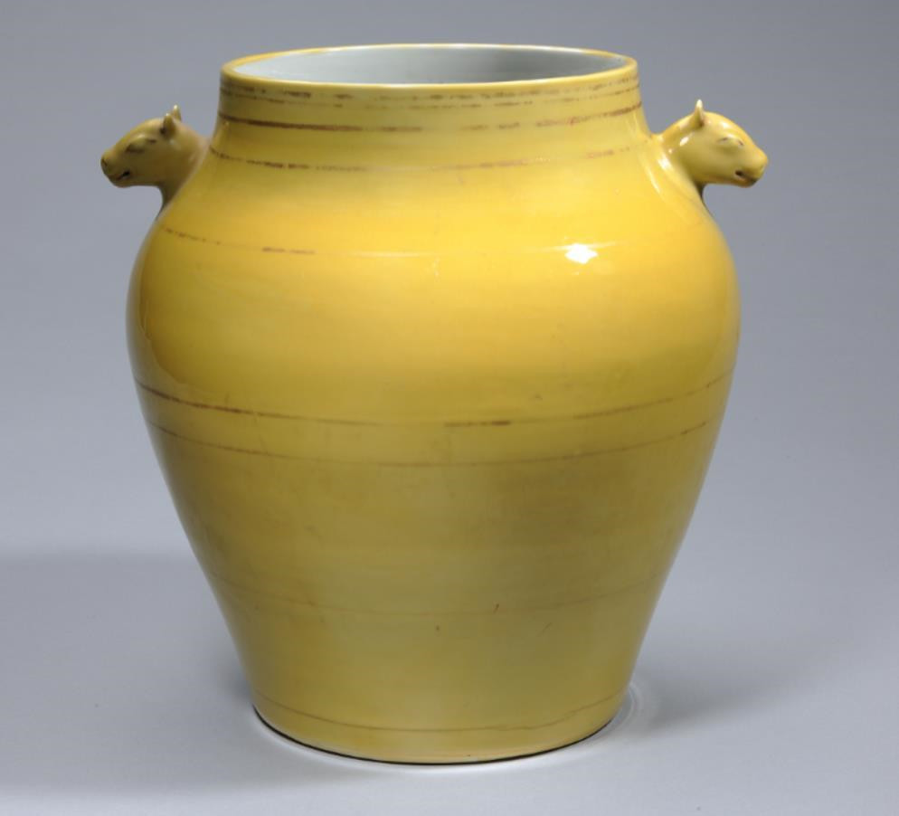 明代以前,皇家祭祀大多用青铜器或金银器等金属器,到明代时,皇家一改传统,明朝洪武二年,朱元璋明文"祭器皆用瓷”。明代弘治朝时,皇帝朱佑樘让御窑厂烧制黄釉礼器,御窑厂便仿照前朝铜器形制,创新的烧制出黄釉牺耳尊。皇家礼器的尊贵,可见一斑。