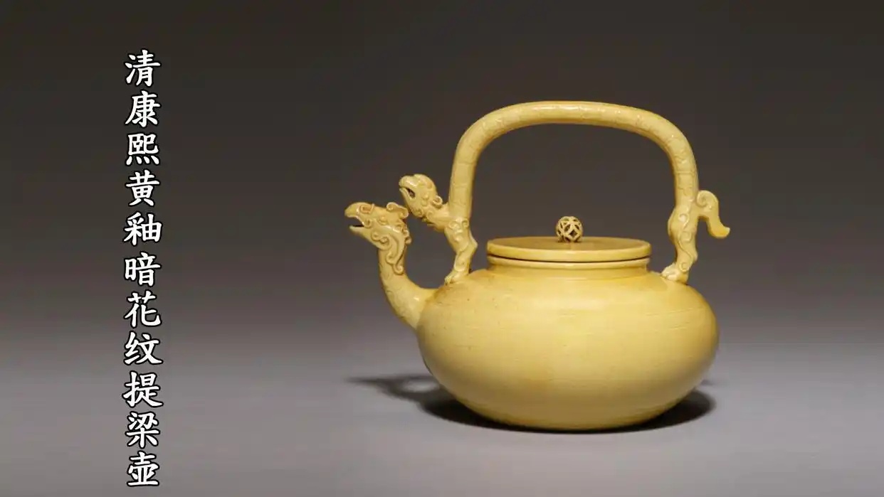 清代早期,依旧沿袭前朝旧制,不仅规定黄釉瓷器为皇家独享,更在《国朝宫史》中明文规定了后宫用瓷的各色黄釉等级。唯独皇后可与皇帝使用内外兼施黄釉的瓷器,史称”黄器“,又称”殿器“。自康熙二十三年(公元1684年)清政府解除海禁,清朝终于以大国姿态向世界敞开怀抱。国家的开放,意识形态的活跃,亦反应在瓷器上。此时的黄釉虽仍为宫廷御用,但形制已发生很大变化,除去盘碗餐具、祭祀用器等,黄釉像脱缰的野马,恣意纵横,出现在很多器物之上,提梁壶、太白尊、观音瓶、莲花盘等等,皇家釉色不再刻板生硬。
