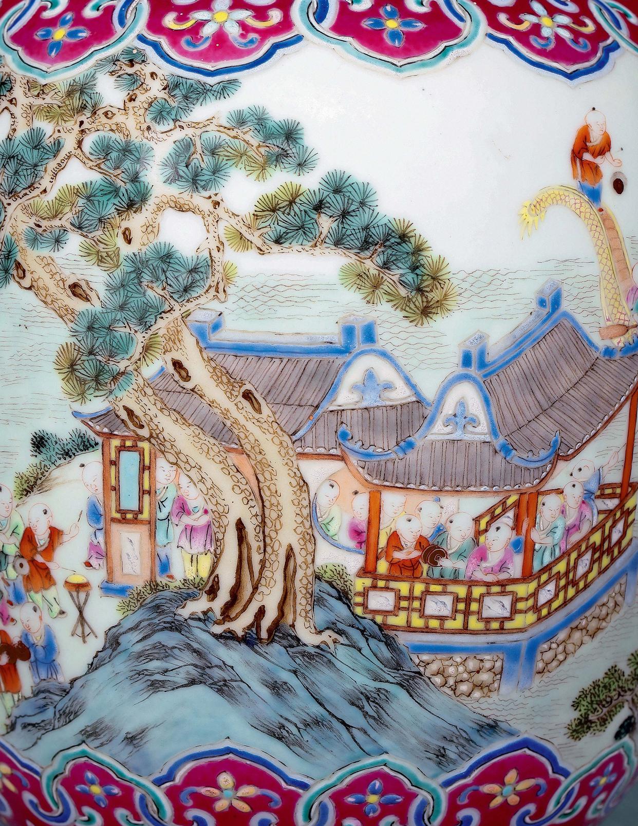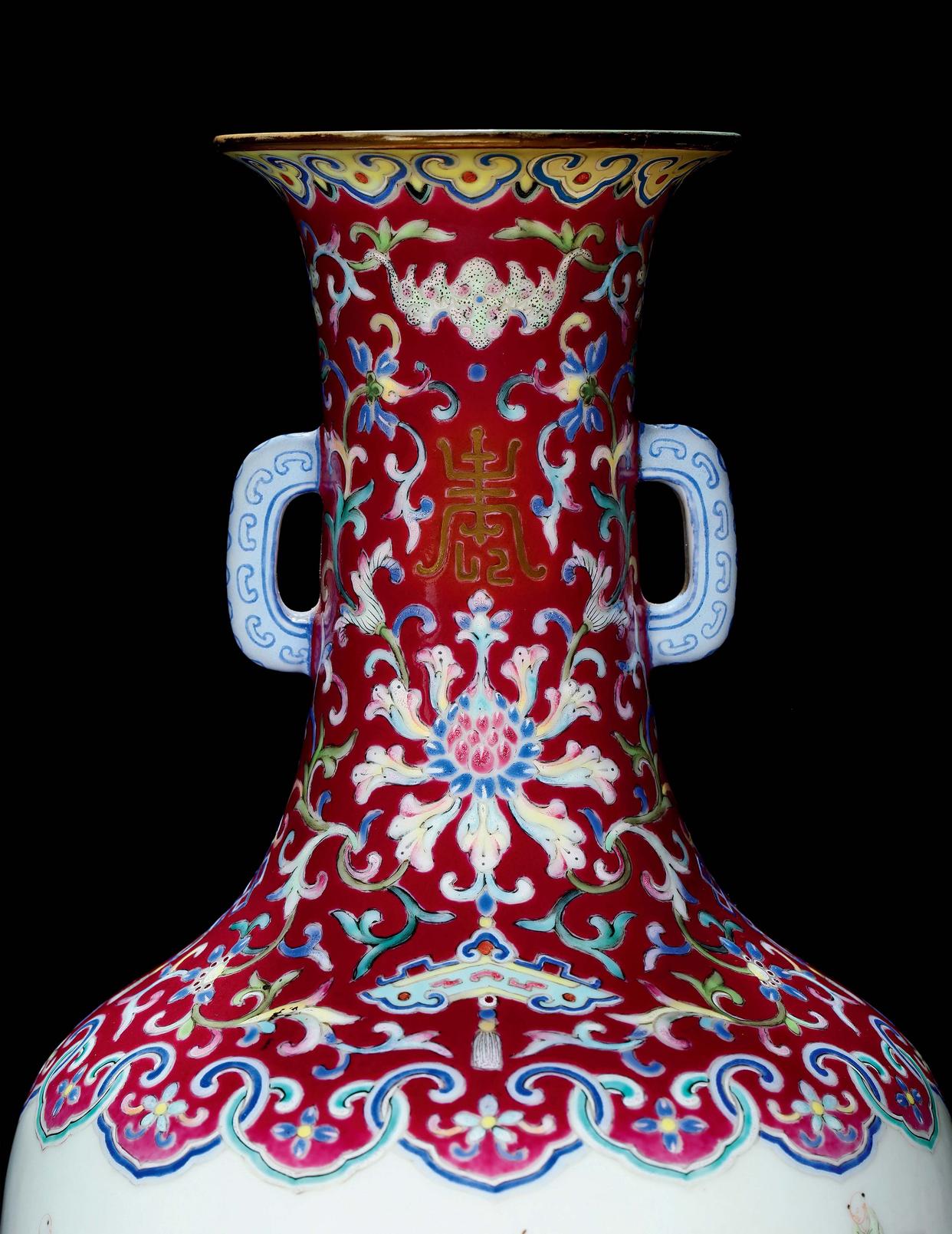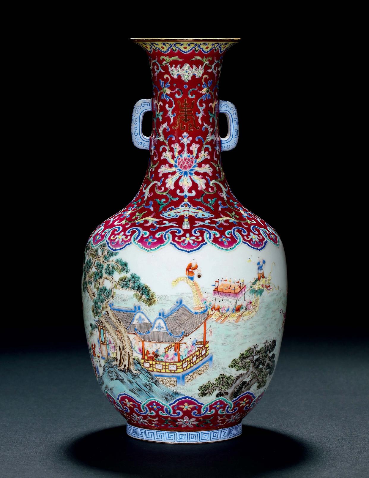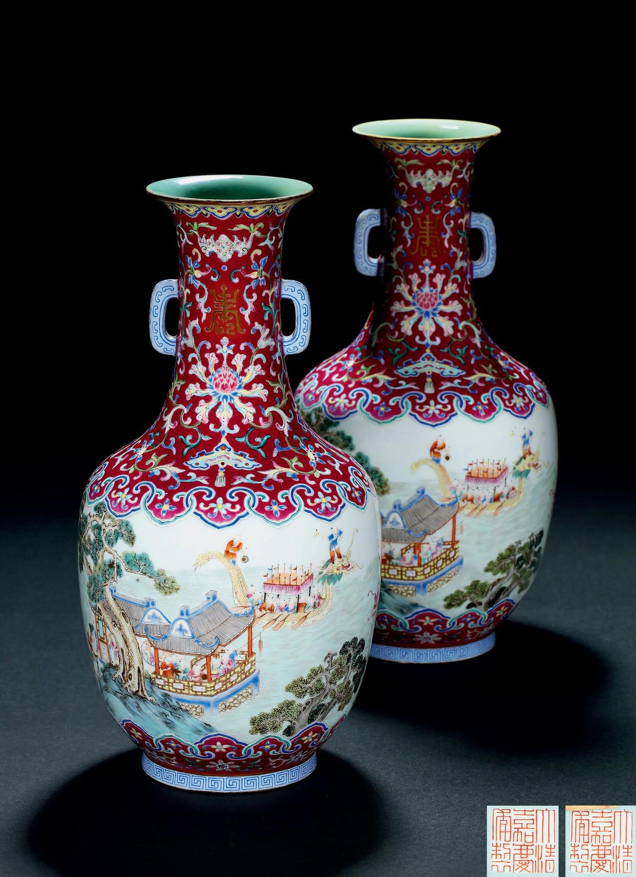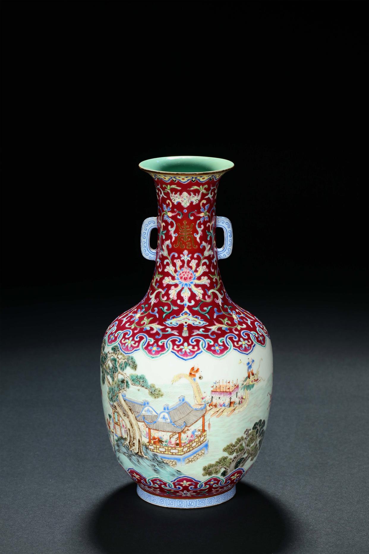 清嘉庆胭脂红地粉彩「百子龙舟」图双耳瓶