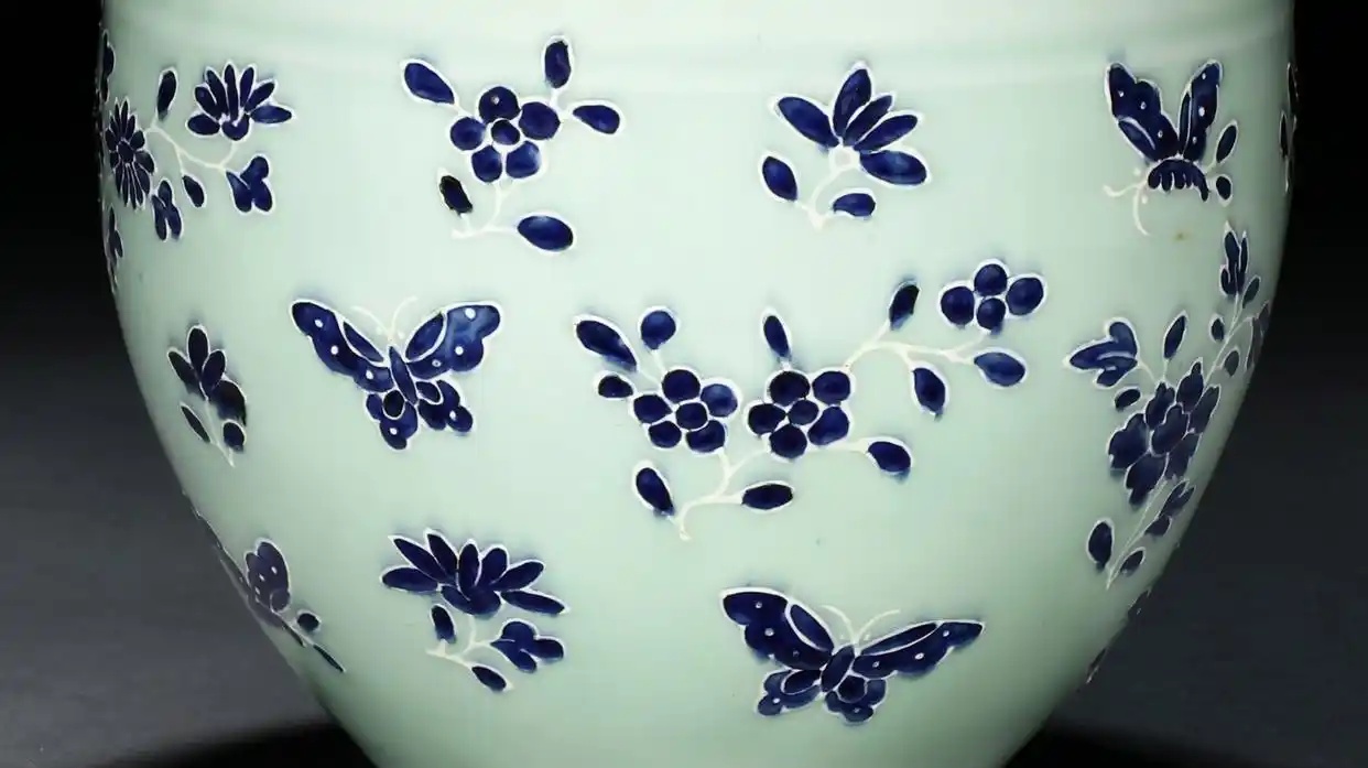 《清乾隆 豆青釉青花折枝花蝶纹卷缸》