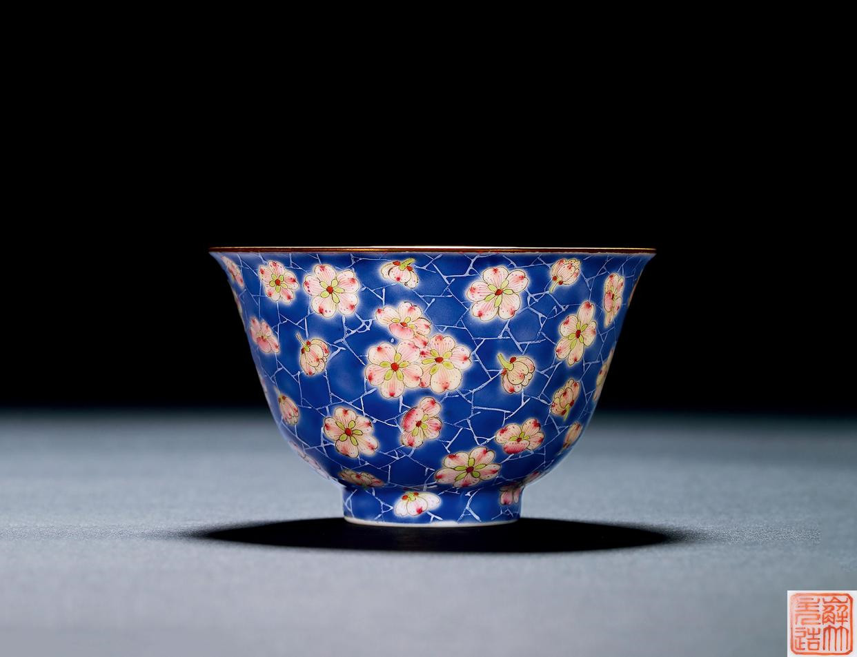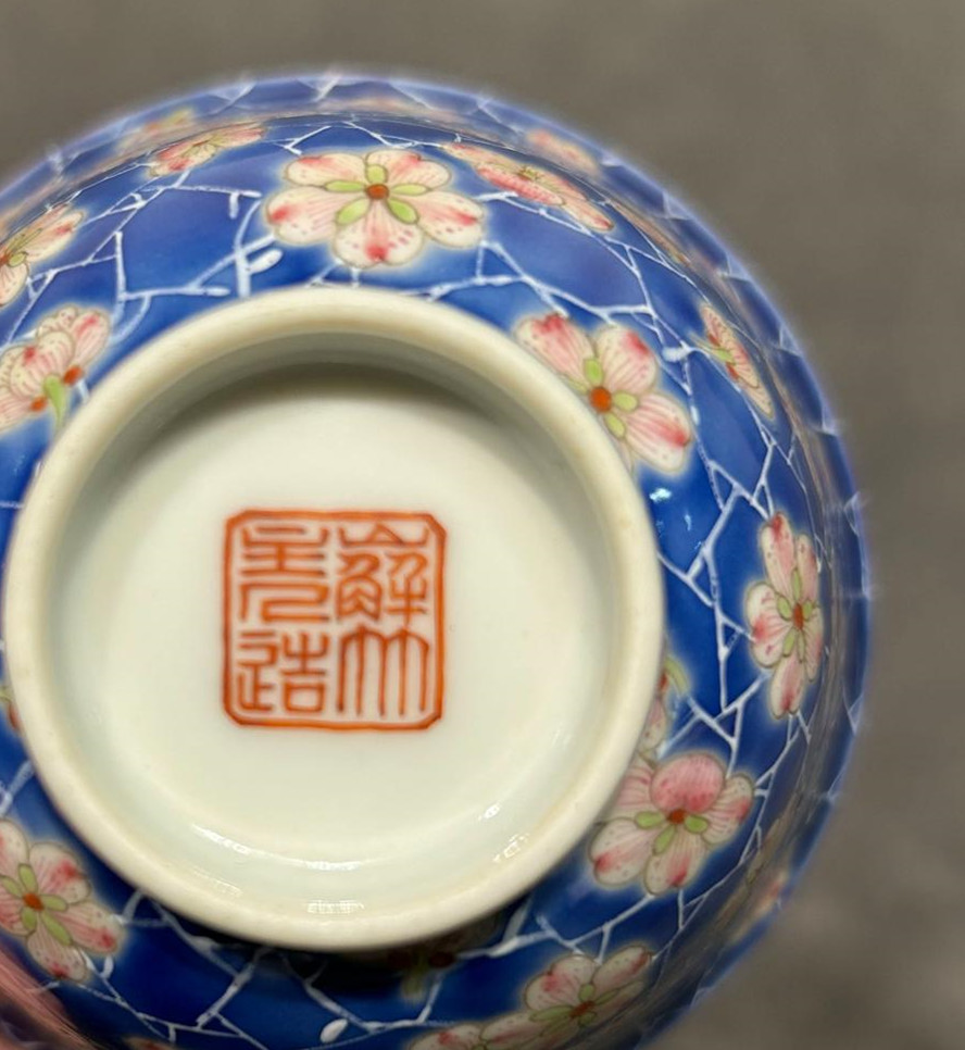 清 道光粉彩蓝地冰梅纹杯 市场价16万