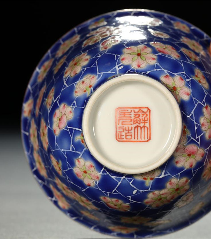本器物撇口圈足,垂腹,通体施粉彩蓝釉为地,绘梅花。冰梅纹以较细白色线条描绘,是典型清中期冰梅纹特征,杯口直径8.6公分,杯底以矾红彩写有“嶰竹主人造”堂款,官窑器。于4月6日,香港保利春拍落锤成交,原被香港万安堂收藏,传承有序。