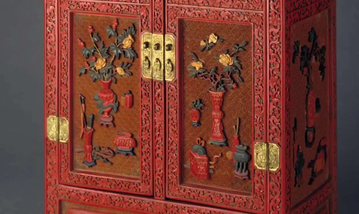 清代 剔红缠枝莲纹开光博古纹柜 局部