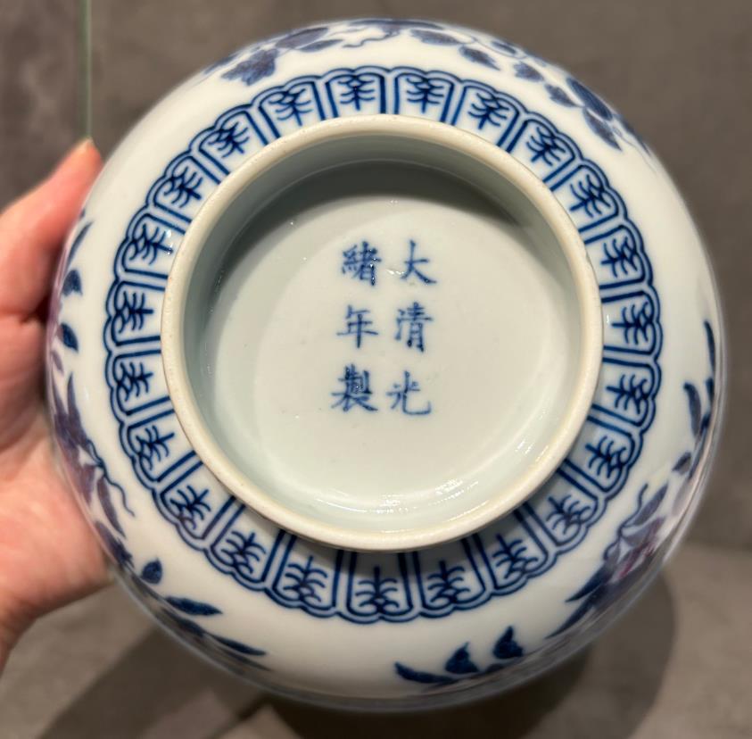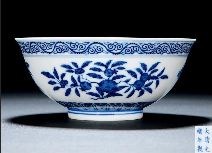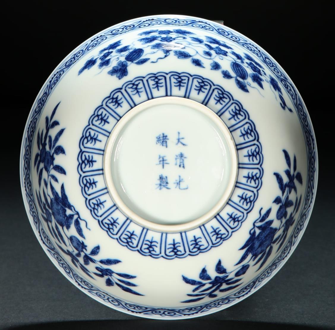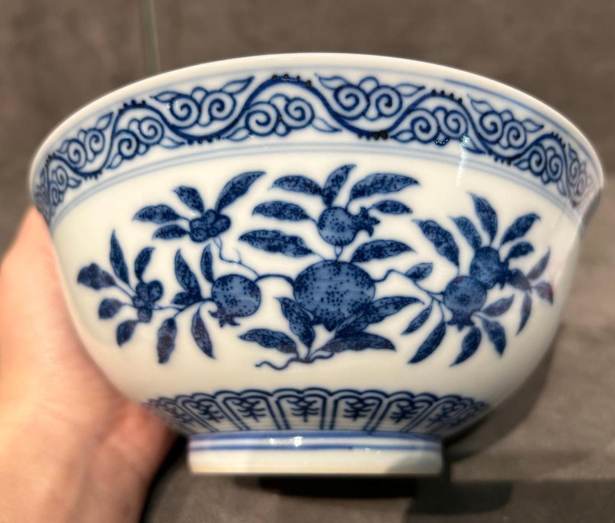 咱们看看这只青花碗,腹部绘有石榴、寿桃、瑞果纹。其实按传统三多纹来讲,是要绘制佛手、桃、石榴。