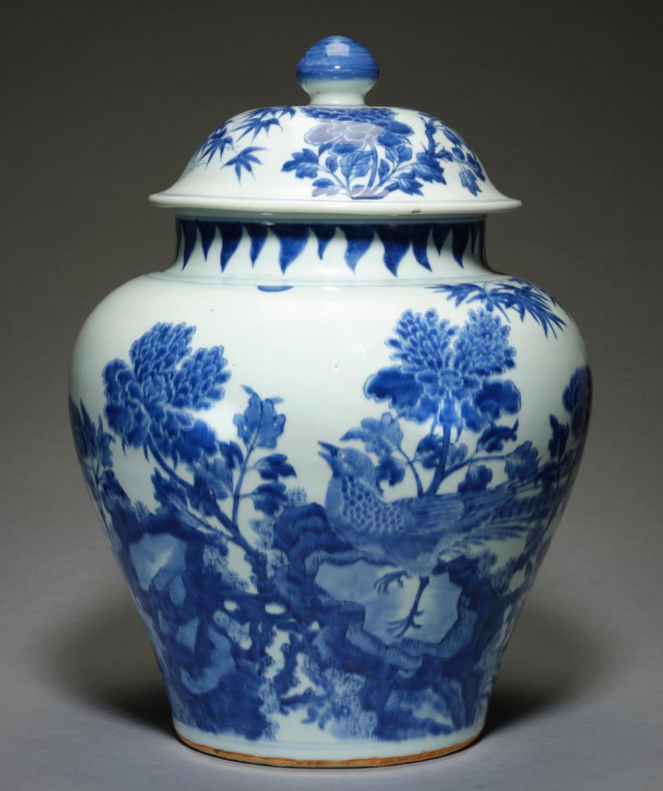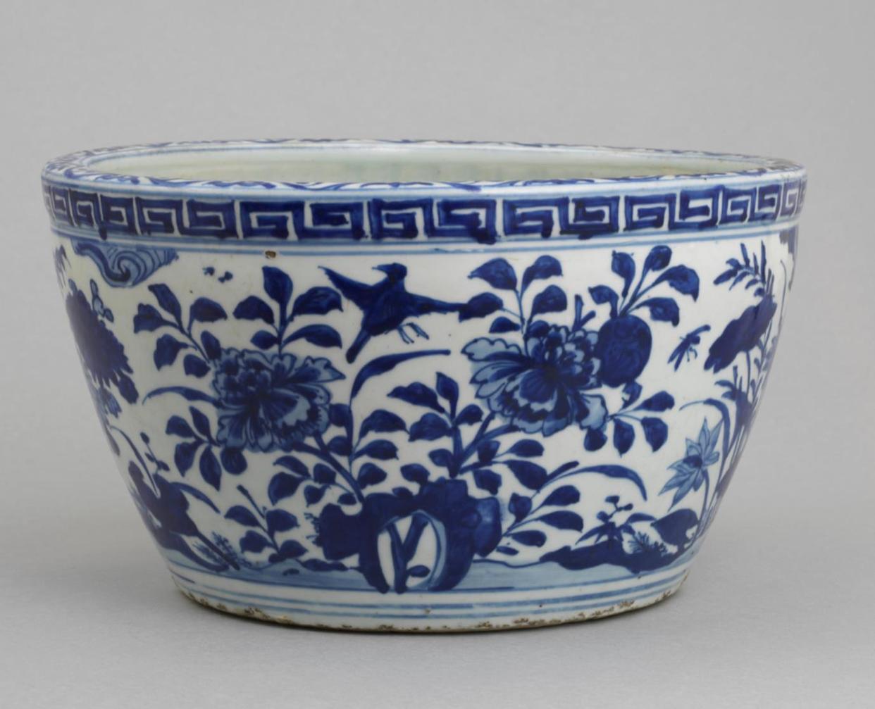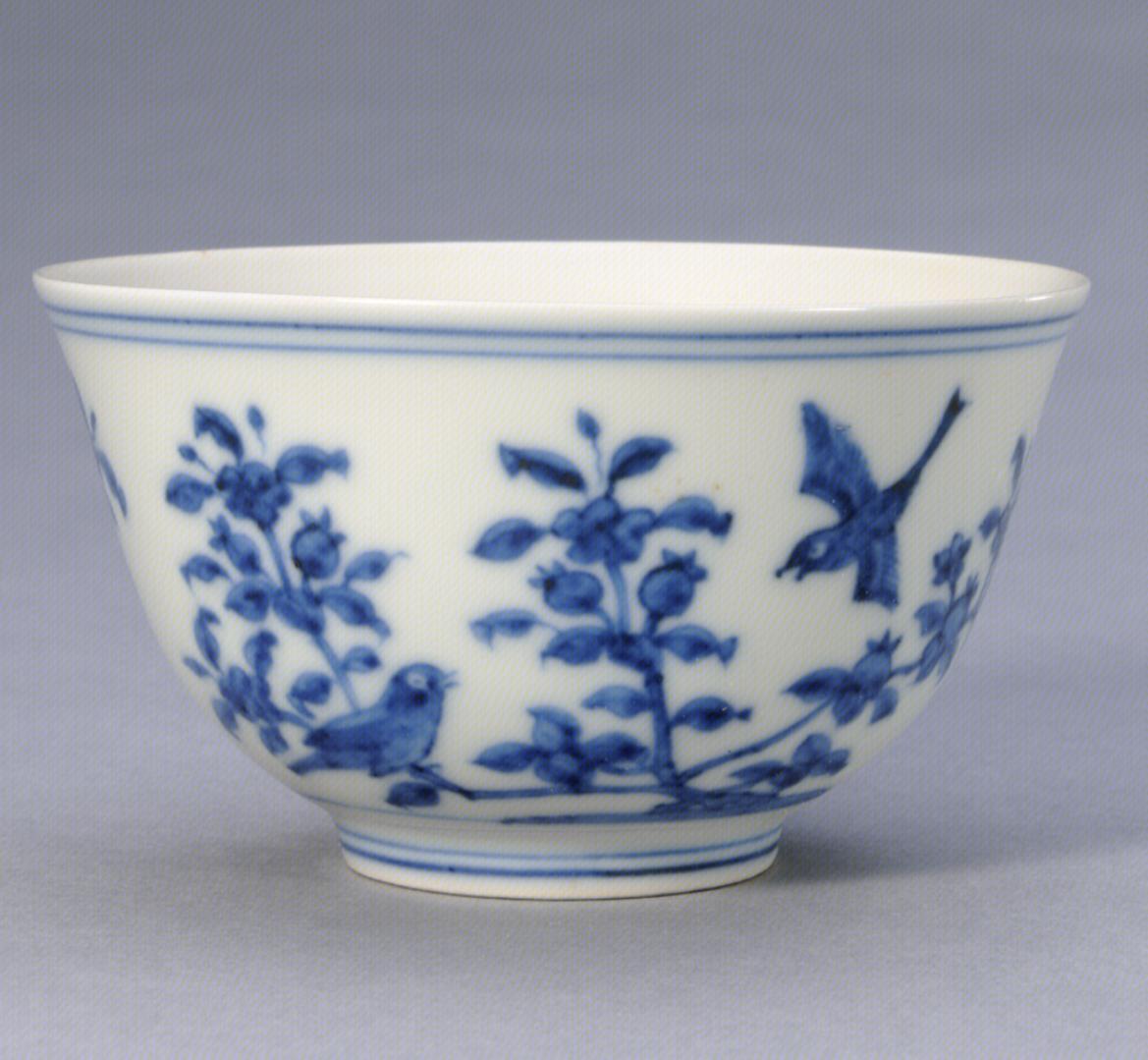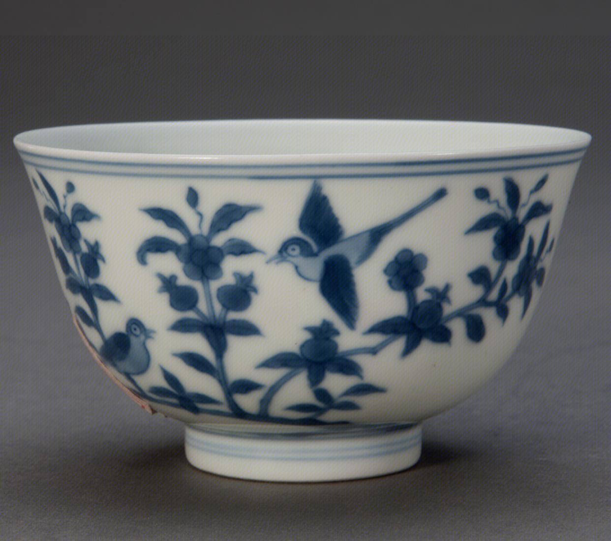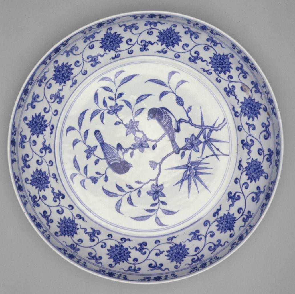 青花花鸟纹饰自明代永乐时期逐渐增多,白头翁、绶带鸟、鹦鹉等等,大多栖于枝头,憨态可掬,至宣德时期,飞鸟有了生机,画片中的鸟儿神态各异,相比前朝大多更富动态之势。
