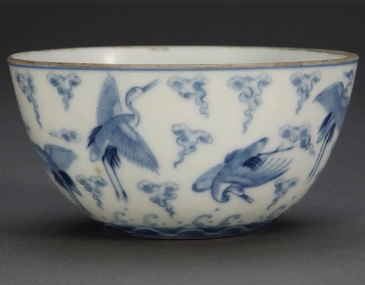 《淮南子·说林训》:“鹤寿千岁,以报其游”。千年前,鹤就被赋予了延年益寿的寓意,明清两代,无论官窑还是民窑,云鹤纹都被广泛的绘于青花瓷上。尤其是明代嘉靖时期,因为朱厚熜信奉道教甚至达到了痴迷的地步,仙风道骨的鹤,更是被大量的绘在官窑青花瓷上。
