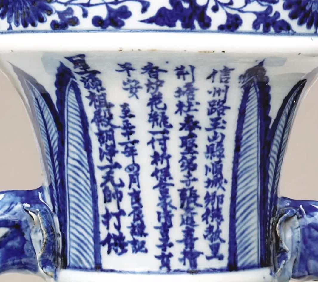 元代至正十一年,也就是1351年,一位名为张文进的信徒,为江西省婺源县灵顺庙订烧一对青花象耳瓶,但在订烧第二年,灵顺庙被毁,后来这对瓷瓶几经流转进入了智化寺,贡于大殿之上。那时候,世人只知道“永宣”青花,大家都一致的认为青花是明代“永宣”时期创烧,但这瓶颈之上写的却是元代的纪年,于是琉璃厂的一众古董商们都觉得这对瓶子造的太假,年代都是胡乱编排的。收购象耳瓶的古董商见捡漏不成,一下子像泄了气的皮球。琢磨半天,寻思着这东西不能砸手里,外国人不认识汉字,我高低得把这东西忽悠给外国人。