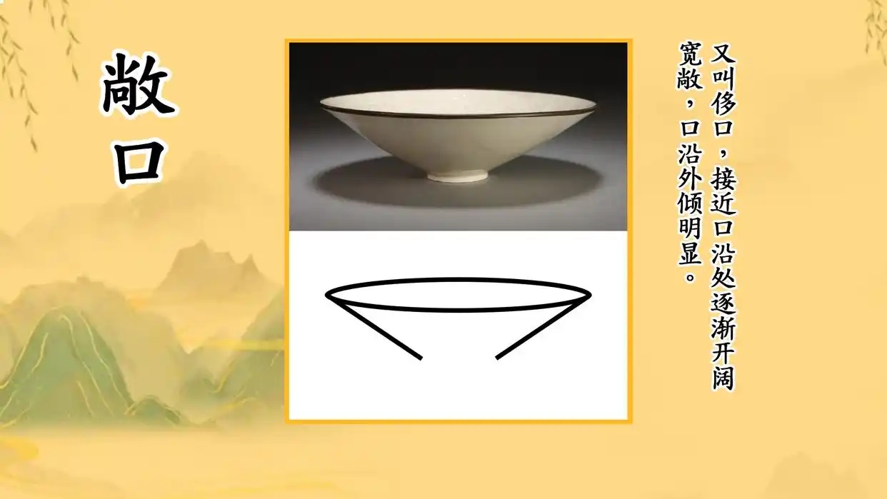 敞口。又叫侈口,接近口沿处逐渐开阔宽敞,口沿外倾明显。