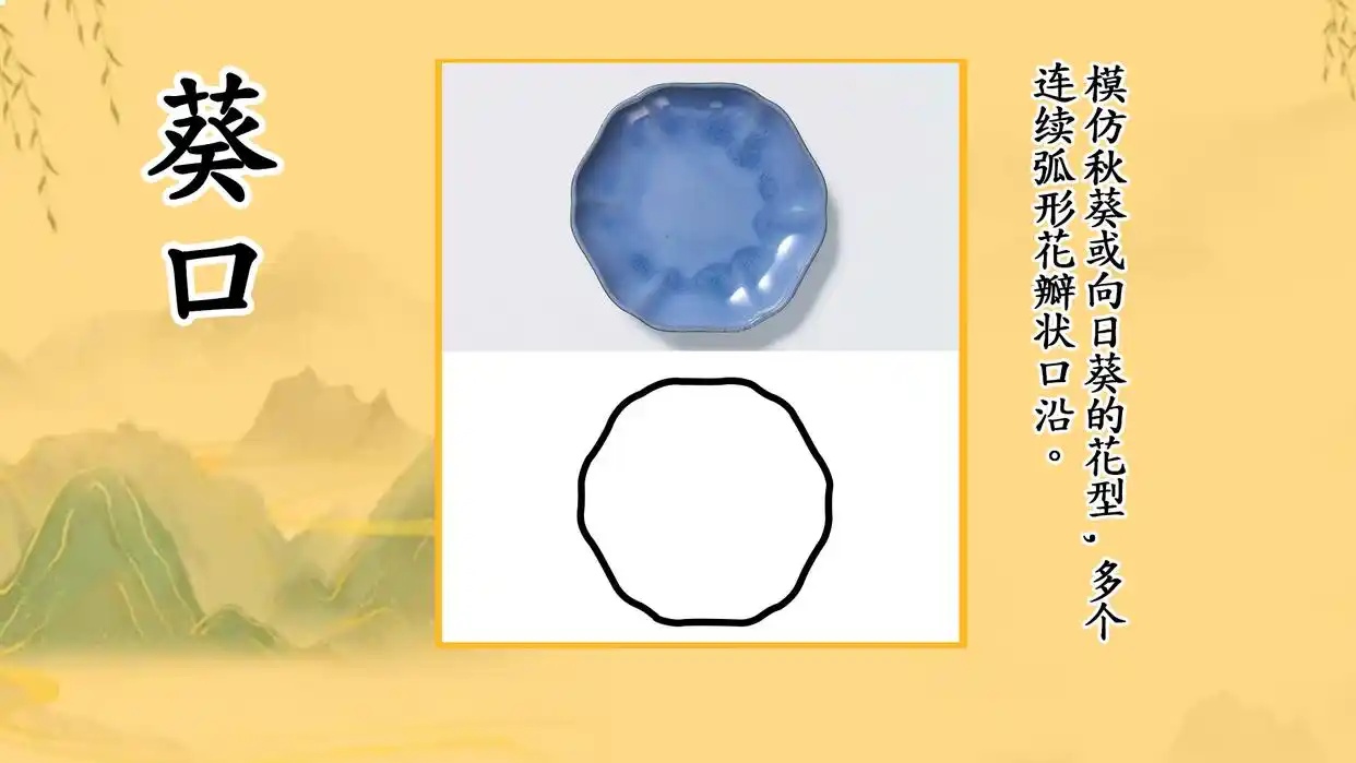 葵口,是模仿秋葵或向日葵的花型。多个连续弧形花瓣状口沿,秋葵花型通常花瓣数量较少,向日葵花型的,花瓣有数十片之多。
