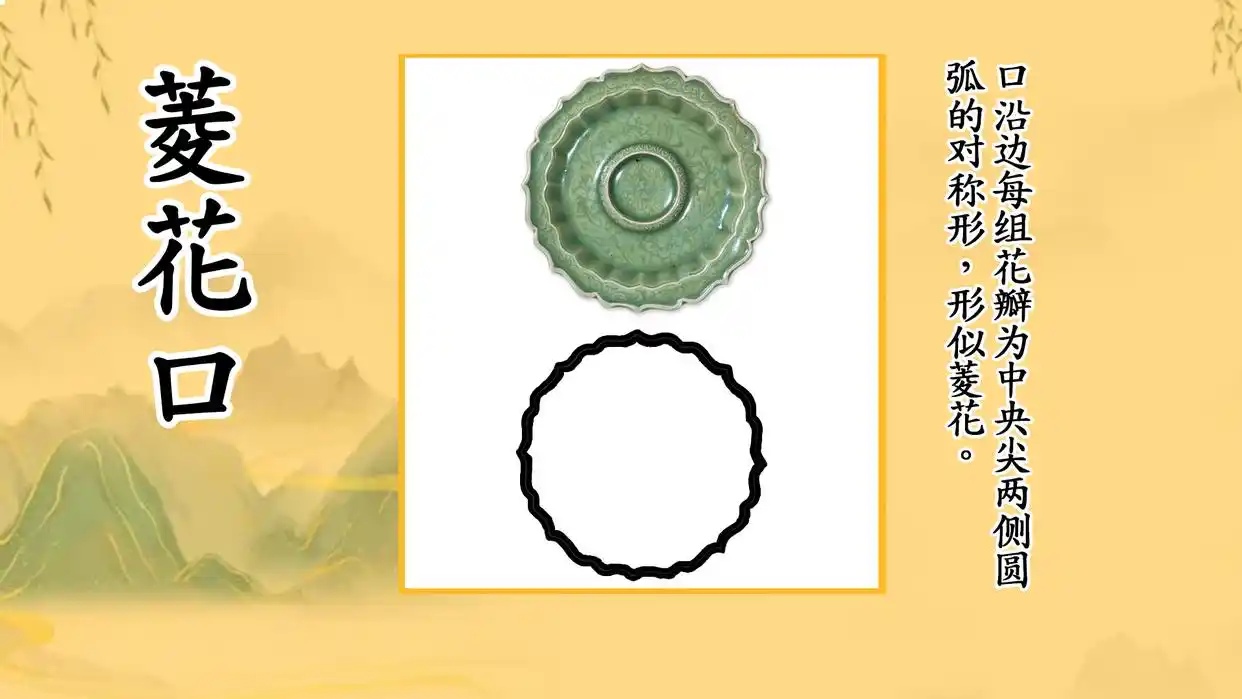 菱花口,口沿边每组花瓣为中央尖两侧圆弧的对称形,使整个器物口沿的线条富于变化,形似菱花。