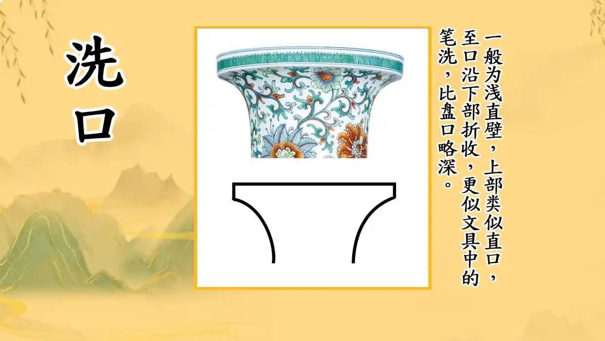 洗口,一般为浅直壁,上部类似直口,至口沿下部折收,更似文具中的笔洗,比盘口略深。
