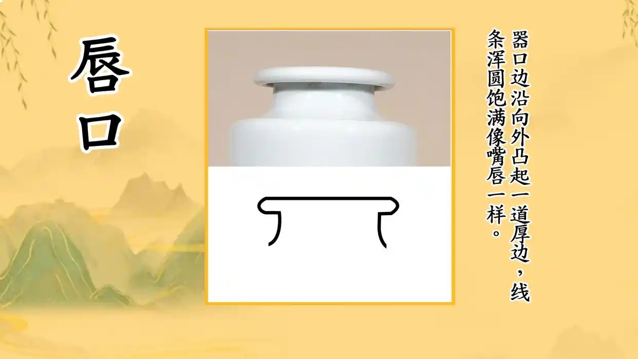 唇口,器口边沿向外凸起一道厚边,线条浑圆饱满像嘴唇一样。