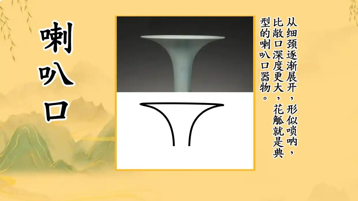 喇叭口,特点是从细颈逐渐展开,形似唢呐,比敞口深度更大,花觚就是典型的喇叭口器物。