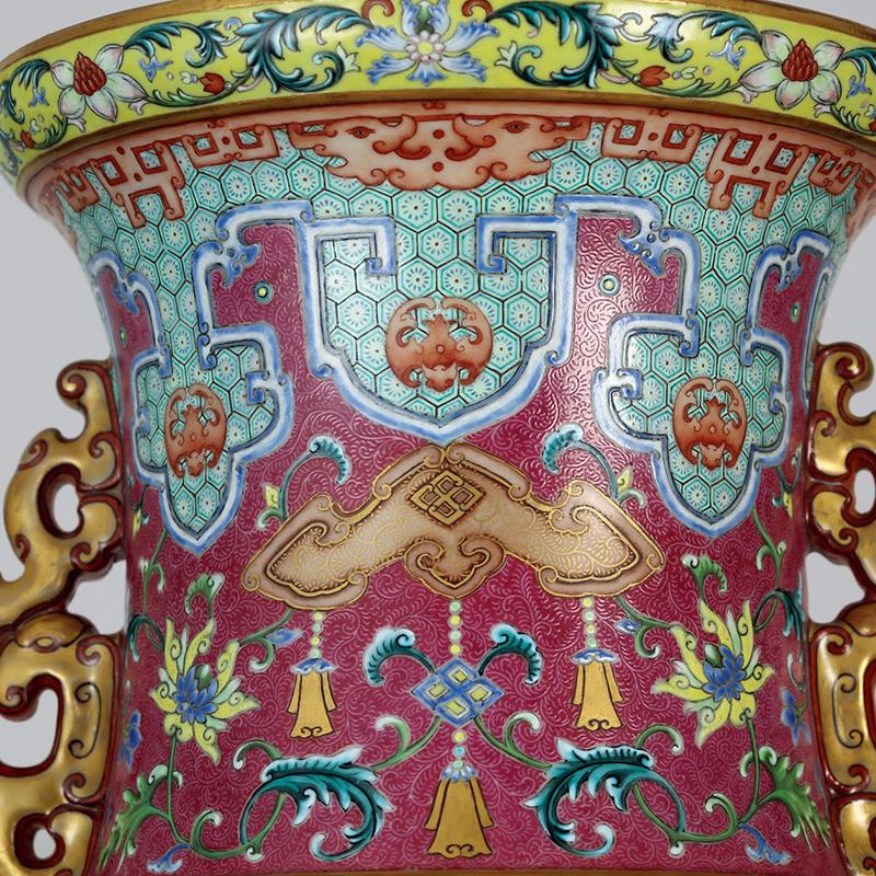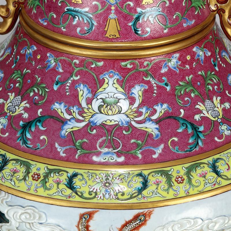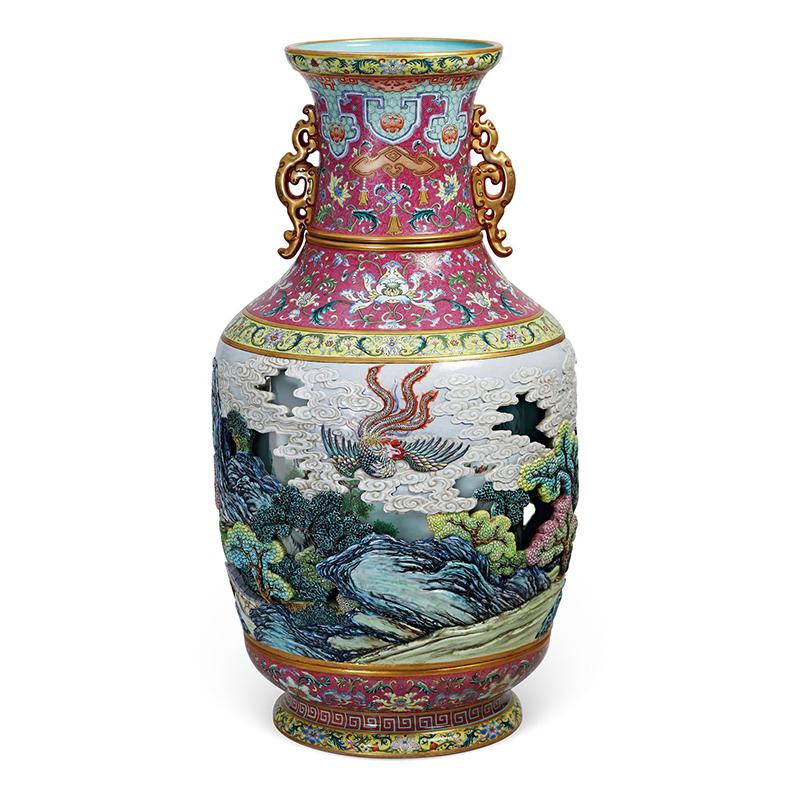 清乾隆 御制洋彩胭脂红地轧道雕瓷镂空“有凤来仪 百鸟朝凤”图双螭耳大转心瓶