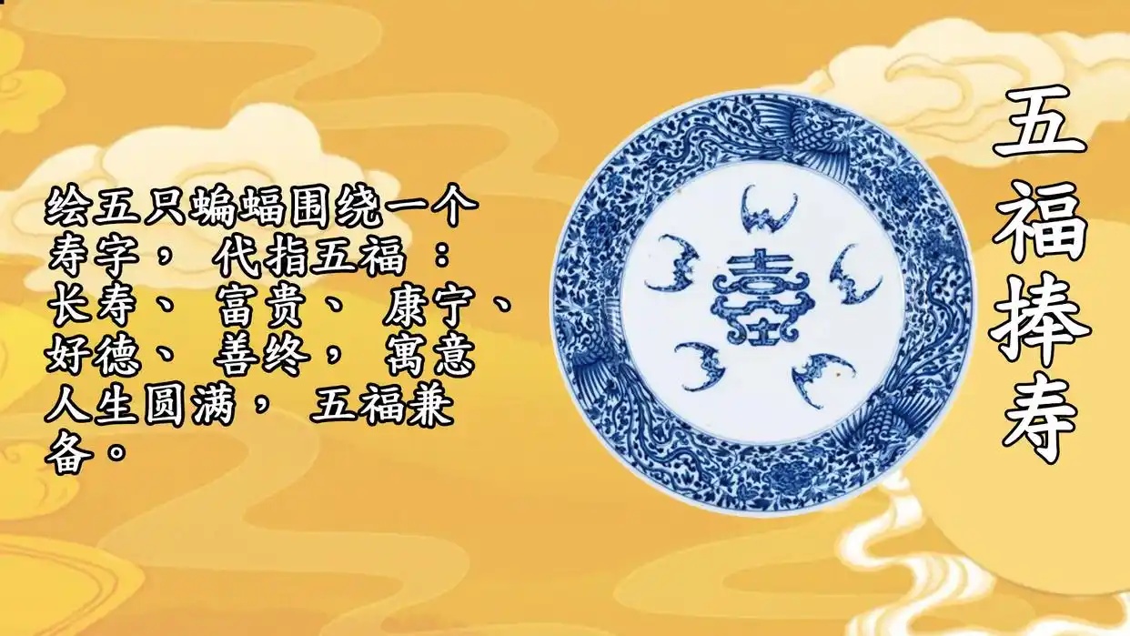 五福捧寿。绘五只蝙蝠围绕一个寿字,代指五福:长寿、富贵、康宁、好德、善终,寓意人生圆满,五福兼备。