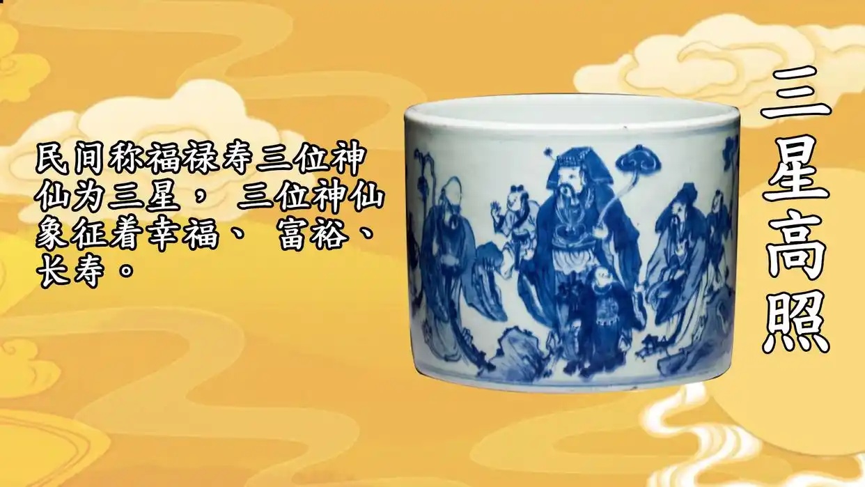 三星高照。民间称福禄寿三位神仙为三星,三位神仙象征着幸福、富裕、长寿。