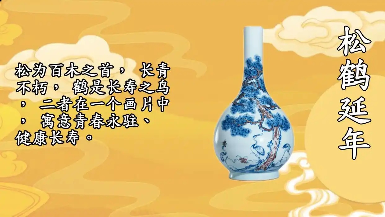 松鹤延年。松为百木之首,长青不朽,鹤是长寿之鸟,二者在一个画片中,寓意青春永驻、健康长寿。
