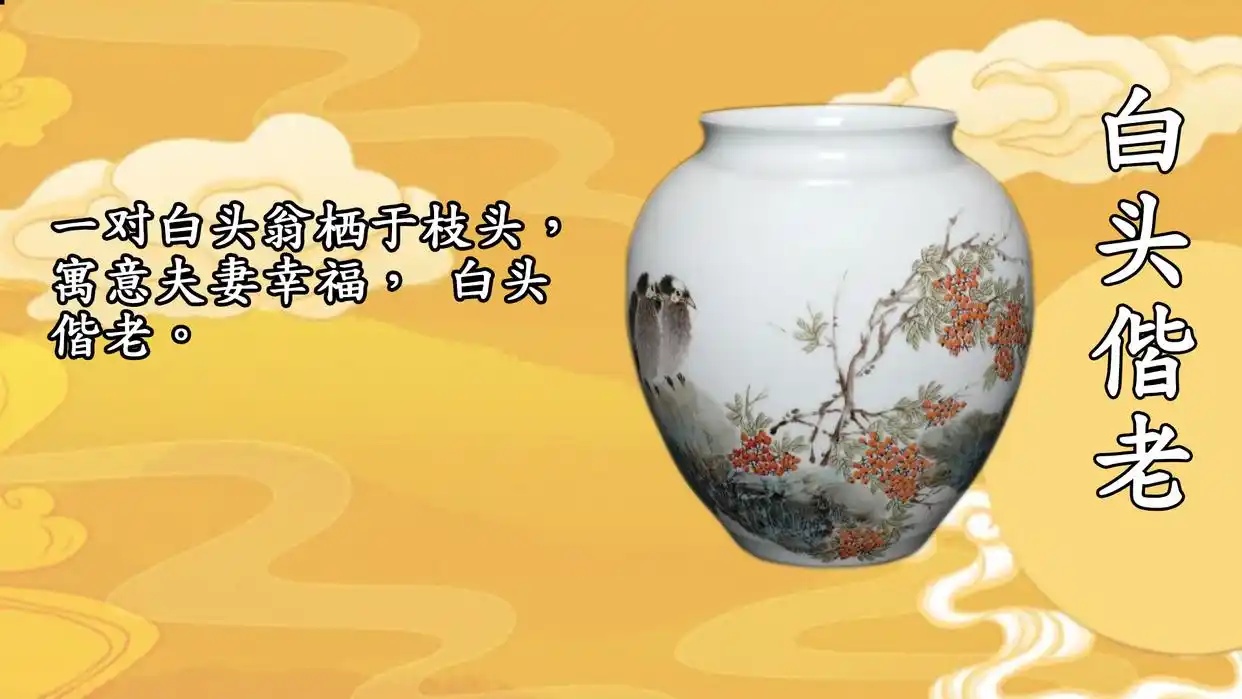 白头偕老。一对白头翁栖于枝头,寓意夫妻幸福,白头偕老。