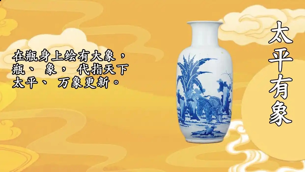 太平有象。纹饰中绘有大象或驼一宝瓶,瓶、象,代指天下太平、万象更新。
