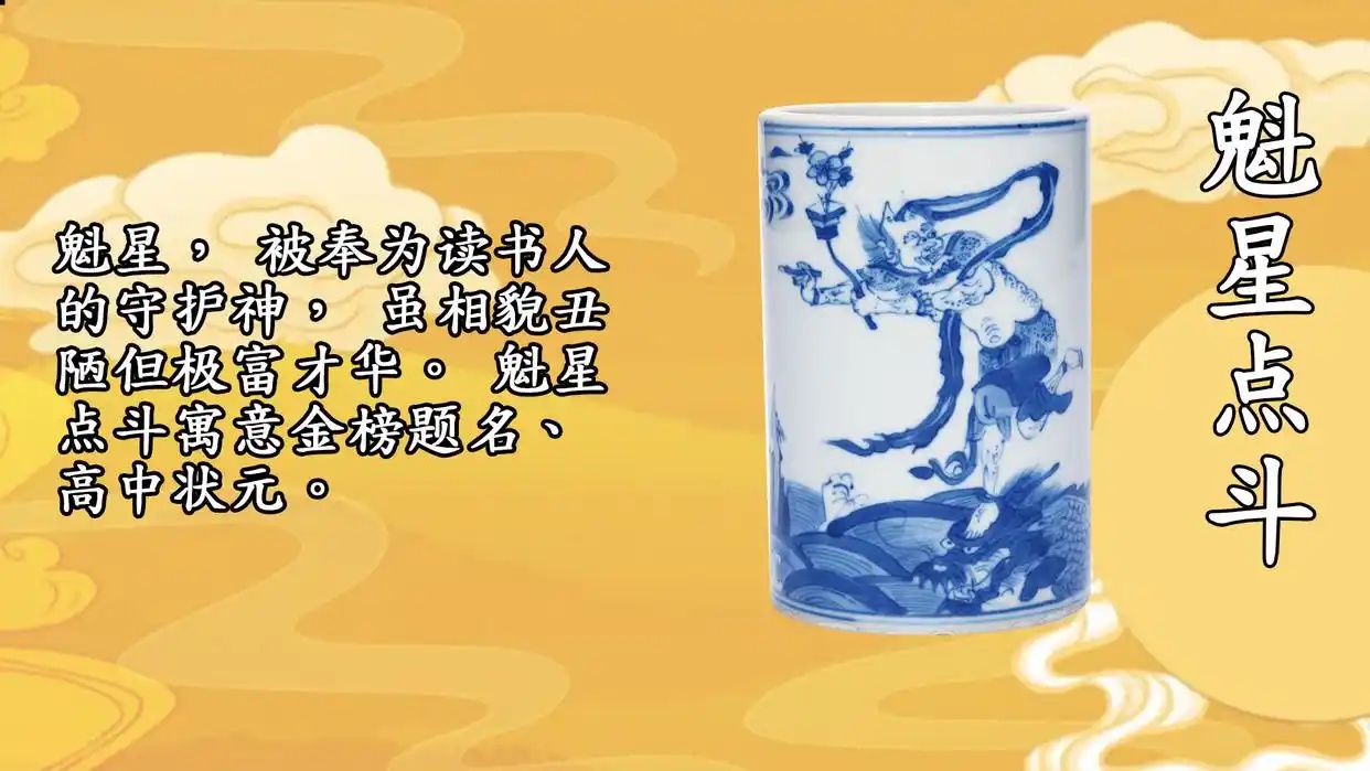 魁星点斗。魁星,被奉为读书人的守护神,虽相貌丑陋但极富才华。魁星点斗寓意金榜题名、高中状元。