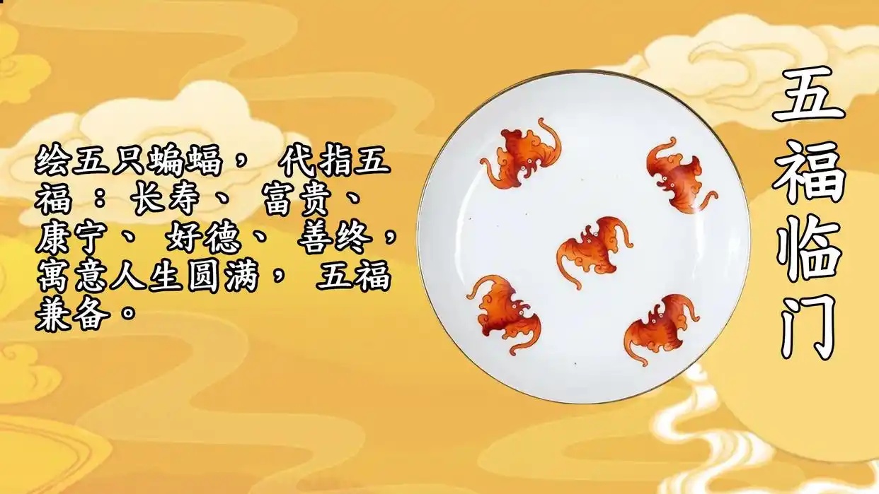 五福临门。绘五只蝙蝠,代指五福:长寿、富贵、康宁、好德、善终,寓意人生圆满,五福兼备。