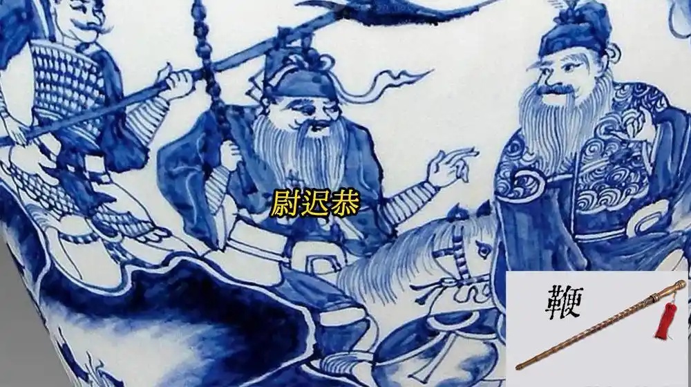 特征:画片中一武将手举钢鞭,胯下骑一战马。钢鞭呈竹节状,与剑长度类似。