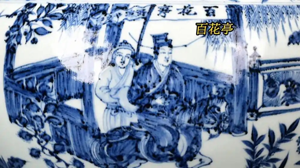 特征:画片背景柳荫、栏栅,绘有一亭台,匾额上书“百花亭”