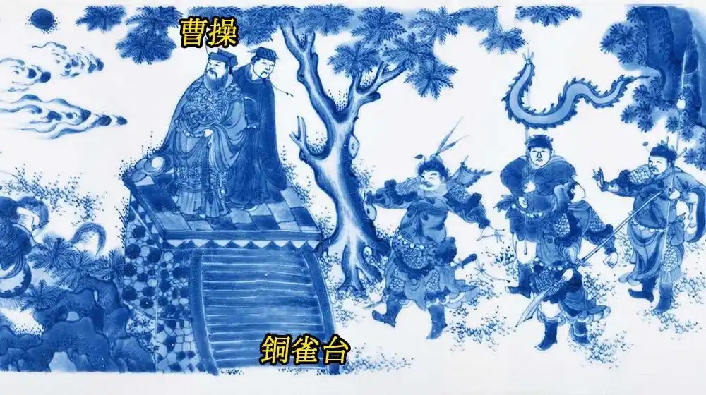 画片特征:一人身穿朝服站立高台上是曹操,台下数名将士或策马扬鞭,或手持兵刃立于一旁。画片中的铜雀台大多是简易的一个台子,只为绘画方便,实际上,它要雄伟的多。