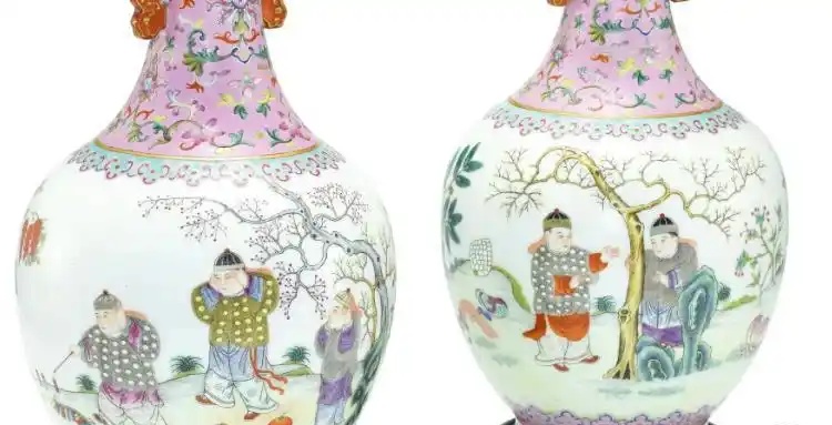 典故:婴,古时代指儿童,并非今天我们说的婴儿。中国很早就有绘画小孩子的传统,明清时彩瓷的发展更是推动了将儿童画片广泛的绘上瓷器。儿童们或蹴鞠或嬉戏,稚嫩可爱。婴戏图象征着多子多福,生活美满。