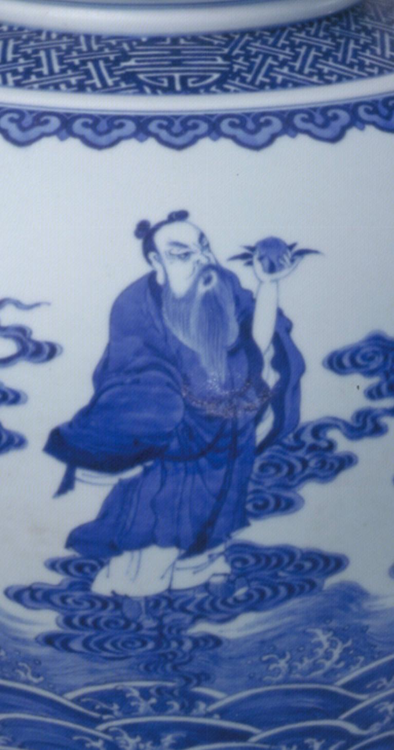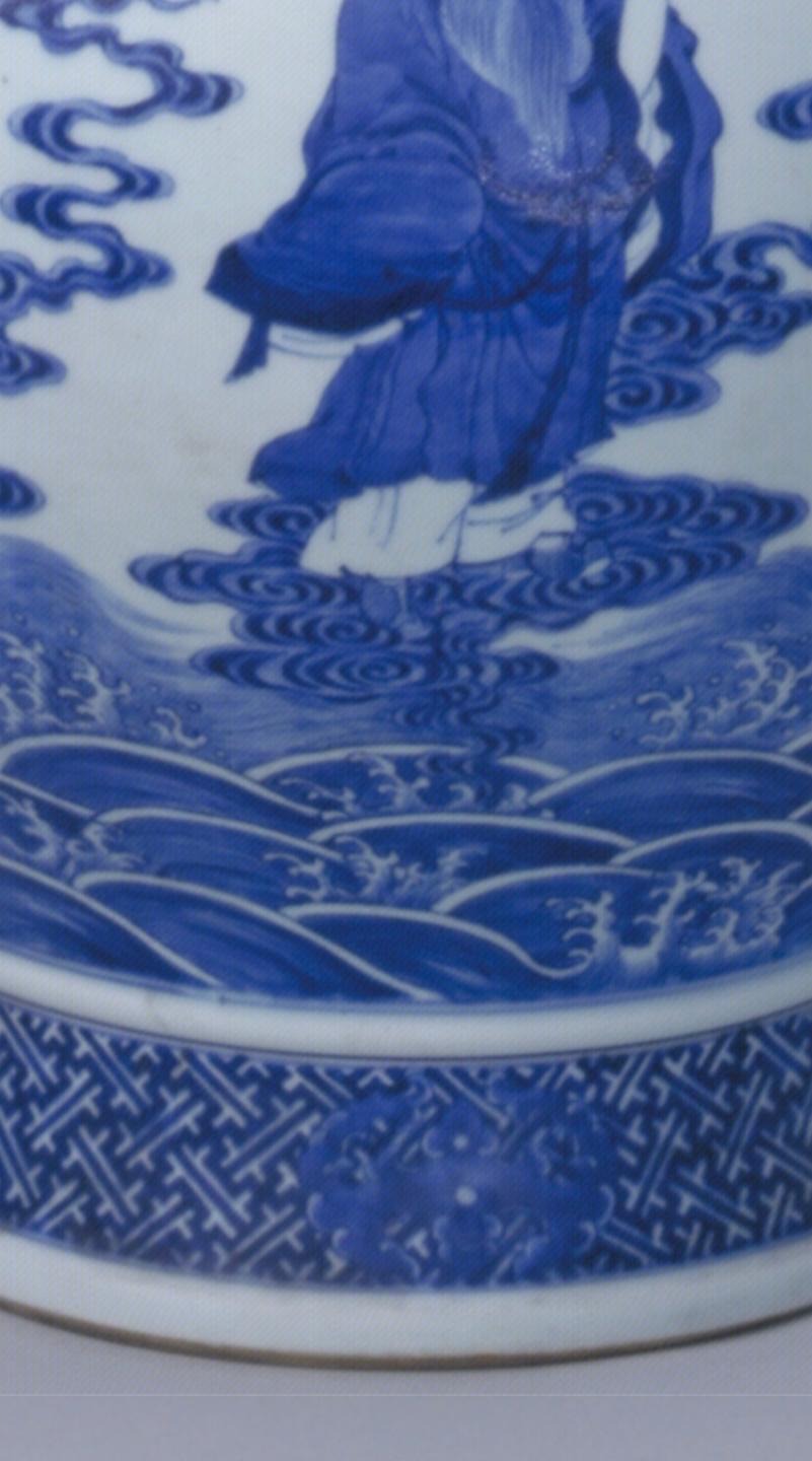地“寿字纹和垂如意云头纹,其下绘八仙过海图,八位仙人神形各异,立于行云流水间。圈足外墙绘锦地蝙蝠纹。
