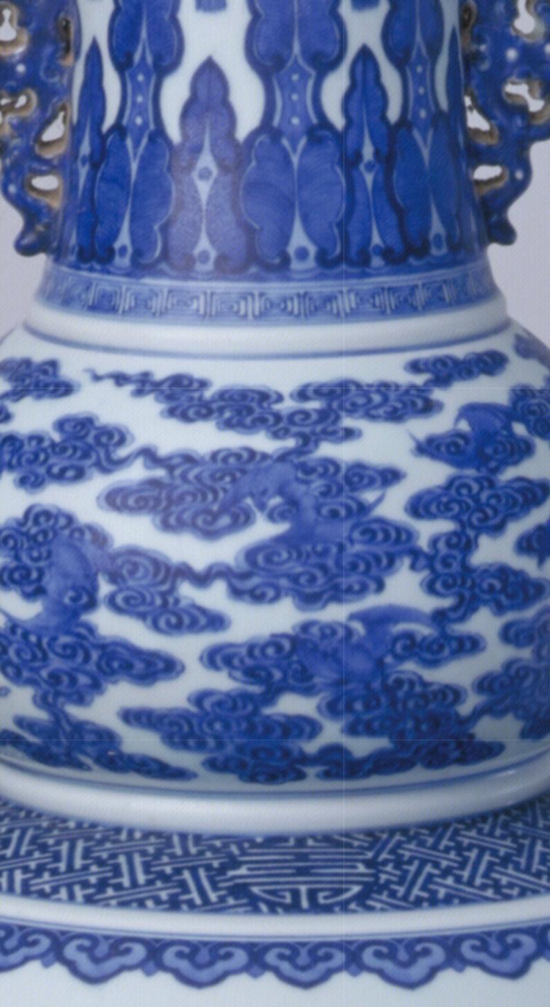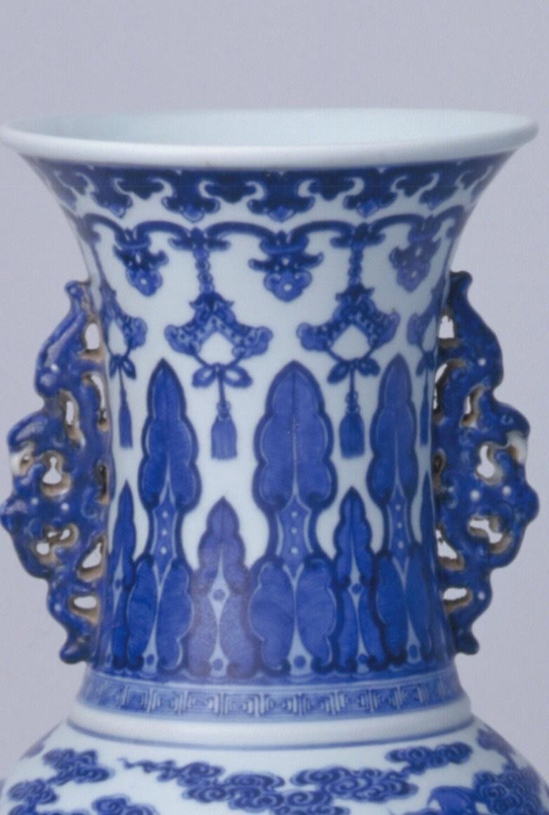 瓶撇口、束颈、葫芦形瓶身、外撇圈足。颈部两侧对称置夔凤耳。瓶内、外和圈足内均施白釉,足端无釉。外壁青花装饰。颈部绘垂如意云头纹和仰焦叶纹,上腹绘祥云蝙蝠图,下腹上部绘锦