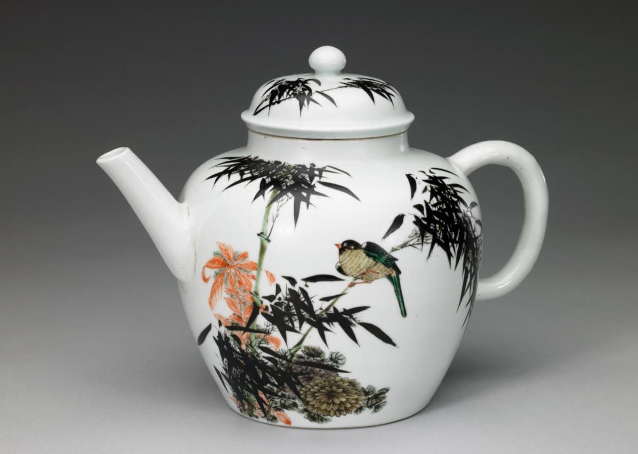 清代黑彩竹鹊纹茶壶
