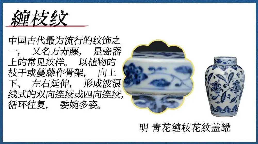 缠枝纹。中国古代最为流行的纹饰之一,又名万寿藤,是瓷器上的常见纹样。以植物的枝干或蔓藤作骨架,向上下、左右延伸,形成波浪线式的双向连续或四向连续,循环往复,委婉多姿。