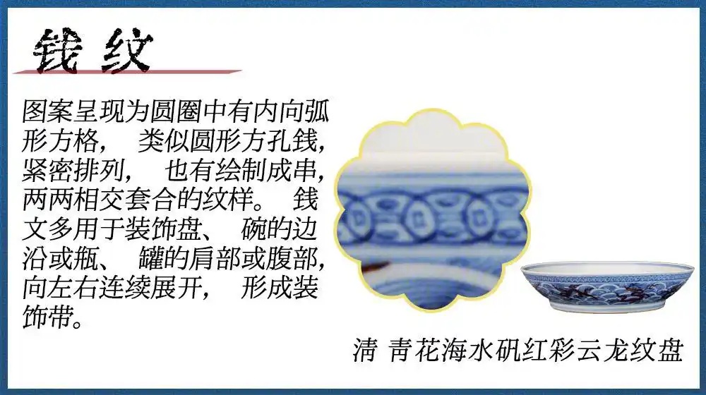 钱纹。图案呈现为圆圈中有内向弧形方格,类似圆形方孔钱,紧密排列,也有绘制成串,两两相交套合的纹样。钱文多用于装饰盘、碗的边沿或瓶、罐的肩部或腹部,向左右连续展开,形成装饰带。