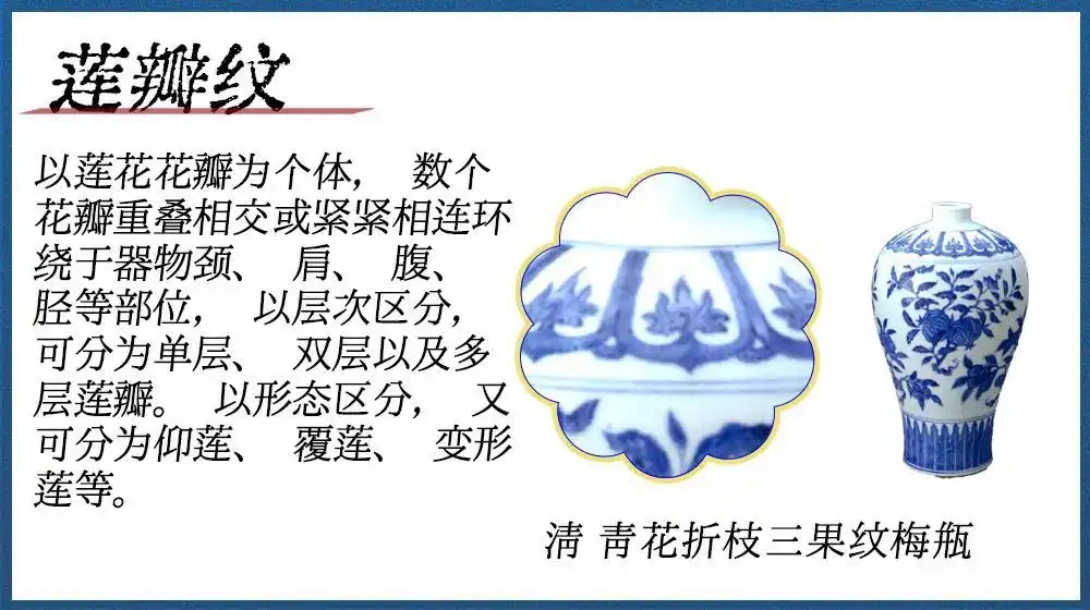 莲瓣纹。以莲花花瓣为个体,数个花瓣重叠相交或紧紧相连环绕于器物颈、肩、腹、胫等部位,以层次区分,可分为单层、双层以及多层莲瓣。以形态区分,又可分为仰莲、覆莲、变形莲等。