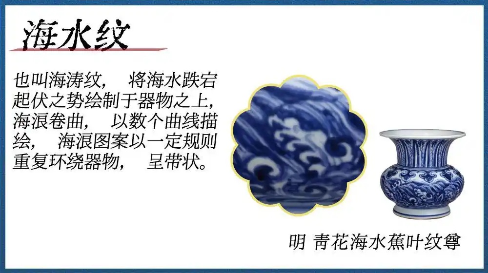海水纹。也叫海涛纹,将海水跌宕起伏之势绘制于器物之上,海浪卷曲,以数个曲线描绘,海浪图案以一定规则重复环绕器物,呈带状。