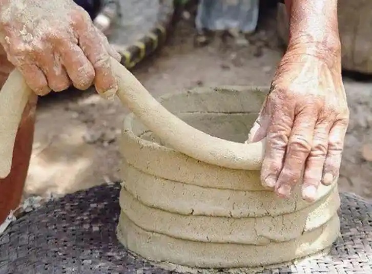 泥条盘筑,古陶器制作的原始方法。将陶土搓成长条,然后按器型需要盘结成型后,里外修饰抹平。