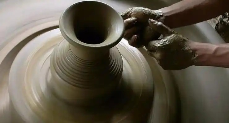 轮制法,是指将泥料放置在轮车上,通过旋转泥料,双手挤压使之成型的制作工艺。