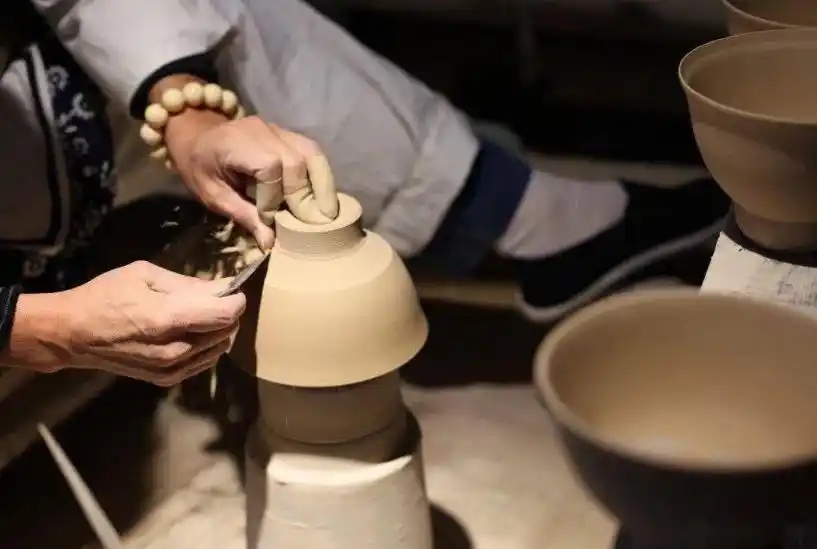 拉坯,制造陶瓷的基本工序之一,通过轮车旋转,将泥料拉成所需器型基本形状。