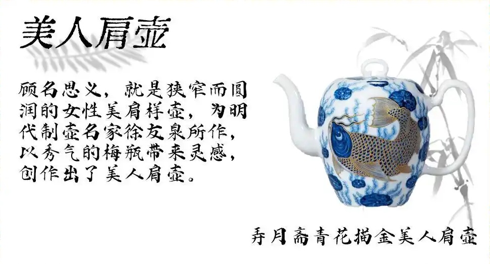 美人肩壶。顾名思义,就是狭窄而圆润的女性美肩样壶,为明代制壶名家徐友泉所作,以秀气的梅瓶带来灵感,创作出了美人肩壶。